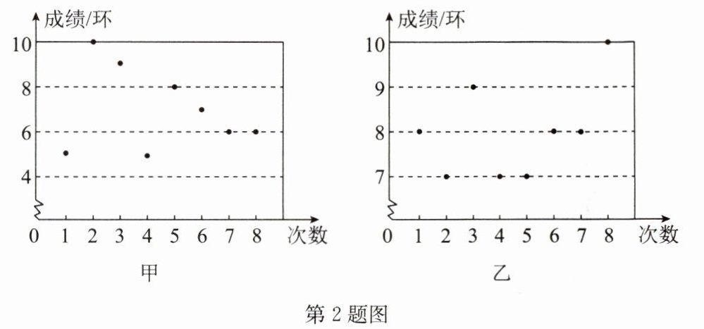 2. (2024·烟台)射击运动队进行射击测试,甲、乙两名选手的测试成绩如图,其成绩的方差分别记为$s_{甲}^{2}和s_{乙}^{2}$,则$s_{甲}^{2}和s_{乙}^{2}$的大小关系是 (