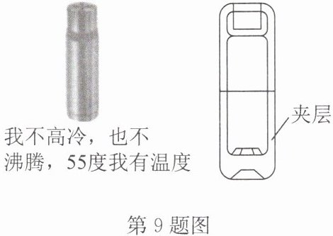 9. (2024秋·宿城区校级月考)如图是一款新型水杯,在杯的夹层中封入适量的固态物质,实现了“快速降温”和“快速升温”的功能,使用时,将水杯上下晃动几分钟,可以将100℃的开水降温至55℃左右的温水,也可以将冷水升温到55℃左右的温水,这款水杯被广泛地称为“55度杯”.“55度杯”在首次使用时的操作以及升、降温时利用的物理原理分别是 (