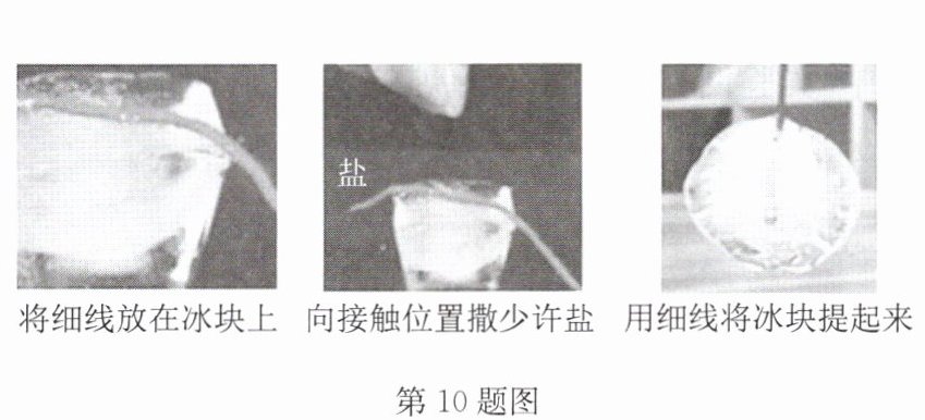 10. (2024秋·海门区期中)如图所示,小明利用一段细线、一小块冰块和少许盐表演了个小魔术. 他先将打湿的细线搭放在冰块上,向细线和冰块的接触位置撒少许盐使冰