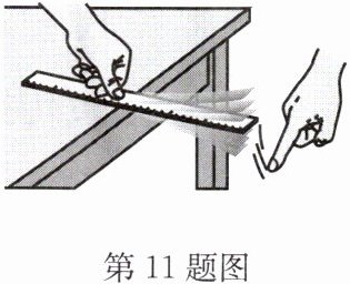 11. (2025·清江浦区模拟)如图所示,将一把钢尺紧按在桌面上,第1次先让一端伸出桌边长一些,拨动钢尺,听它振动时发出的声音,第2次让一端伸出桌边短一些,再用相同大小的力拨动钢尺,听它振动时发出的声音,使钢尺两次振动幅度大致相同,比较两种情况下,第