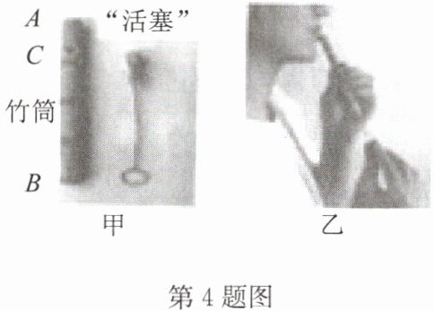 4. 图甲是一手工品,由竹筒(A、B 两端开口,C 处开一小口)和“活塞”组成,将活塞从 B 处塞入,在 A 处吹气并来回拉动“活塞”能发出悦耳的哨音,如图乙所示,下列说法正确的是 (