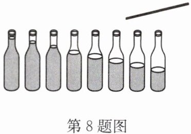8. (2025·靖江市模拟)如图所示,8 个相同的玻璃瓶中灌入不同高度的水,仔细调节水的高度,敲击它们,就可以发出“1、2、3、4、5、6、7、$\dot{1}$”的声音来;而用嘴吹每个瓶子的上端,可以发出哨声.下列说法正确的是 (