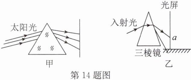 14. (2025·宿迁模拟)如图甲所示是一束阳光照射到三棱镜后出现的情况.好奇的小明将阳光改成红光仍然沿原来的方向照射到三棱镜上(如图乙),在光屏上a点处形成一个红色光斑.现保持入射光位置、方向及三棱镜位置不变,仅将红光改为紫光,以下说法正确的是(