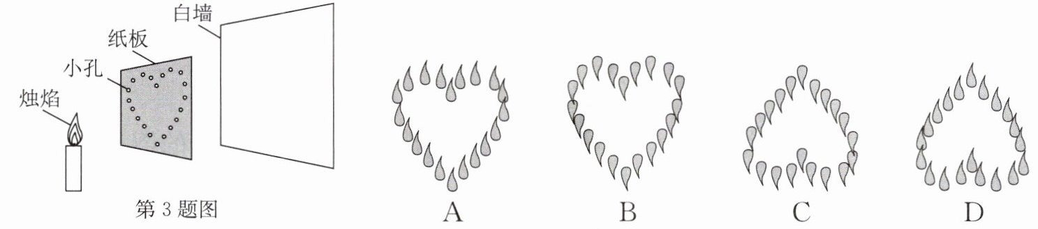 B 点拨:由于光在均匀空气中沿直线传播,烛焰的光通过纸板上很小的小孔,在白墙上将观察到一个心形光斑,心形光斑的每个亮点为烛焰倒立的实像,这是小孔成像现象,因此A、C、D错误,B正确.故选B.