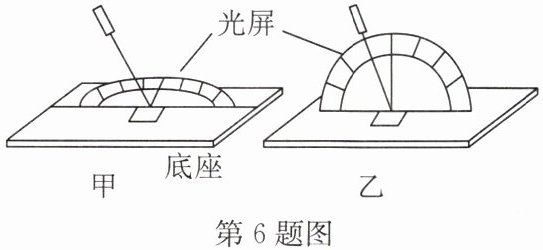 6. 为了寻找反射光线与入射光线构成的平面究竟在哪里,小红用如图甲所示的装置对该问题进行了探究. 将半圆形光屏安装在底座上,使其可以绕水平直径偏转. 平面镜固定在水平底座上,先将光屏倒向后方,用激光笔作光源,将激光束沿固定方向斜射到平面镜中心处. 再向前旋转
