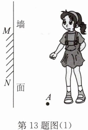 (1) 竖直的墙面上有一块平面镜 $ MN $,小女孩站在平面镜前,她的脚前有一枚硬币如图(1)中点 $ A $ 所示,请你利用平面镜成像的特点画出小女孩看到硬币的像的光路图.