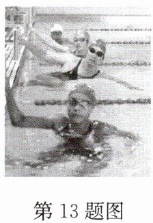 13. 如图所示,岸上的人觉得水中的游泳运动员“腿变短了”,这是光的