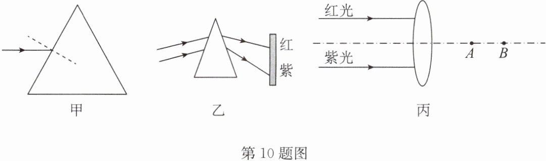 (2)一束白光通过三棱镜折射后,在屏上形成了由红到紫连续排列的彩色光带,如图乙所示;在图丙中,一束红光和紫光平行于主光轴入射凸透镜后,分别经过图乙中的$ A $、$ B $两点,请完成两束光经过凸透镜的光路图.