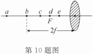 10. (2024 秋·宿城区期末) 在“探究凸透镜成像的规律”的实验中: 如果把点燃的蜡烛分别放在如图所示的 a、b、c、d 和 e 点, 同时调整光屏的位置, 则: 蜡烛在