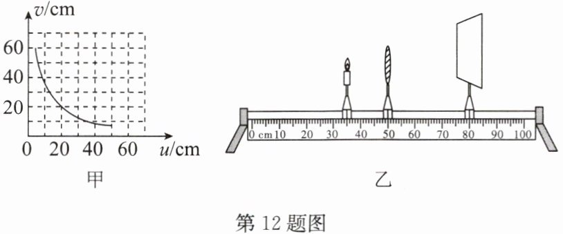 (2) 通过探究, 记录并绘制了像距 v 与物距 u 之间的关系图像, 如图甲所示, 则该凸透镜的焦距是
