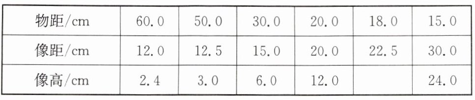 cm. 思考后他还从中发现其他一些规律, 物距为 18.0cm 时, 像高为15.0