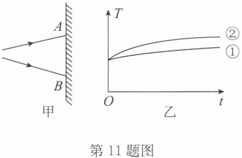 11. (2024秋·姑苏区校级期末)如图甲所示, AB之间是太阳光经三棱镜色散后在屏上得到的彩色光带. 将电子温度传感器分别放在A、B两点外侧, 测得温度T随时间t变化的图像如图乙所示. 则______