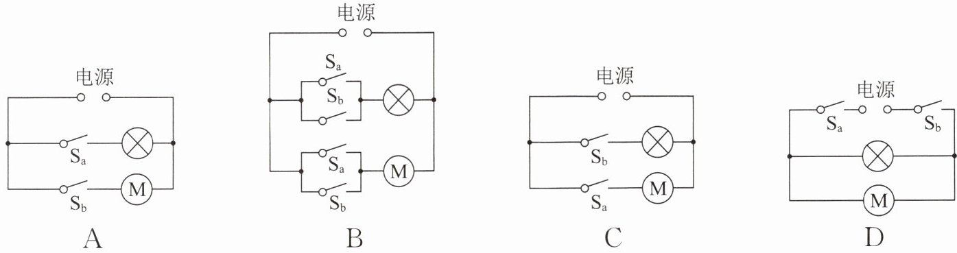 3. (2024·太仓期末)小雅家有一个智能晾衣架,它既可以通过遥控开关$S_{a}$来控制,也可以通过语音开关$S_{b}$来控制,它可以独立升降,也可以独立照明,下列电路图符合要求的是 (