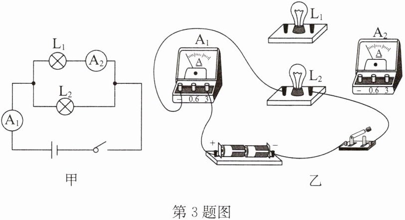 3. (2024·建邺区期末)根据电路图甲,在图乙的实物图上已经画好了一部分连线,请用笔画出剩余的连线。已知电流表$A_1$的示数是1.2A,通过小灯泡$L_2$的电流是0.7A。