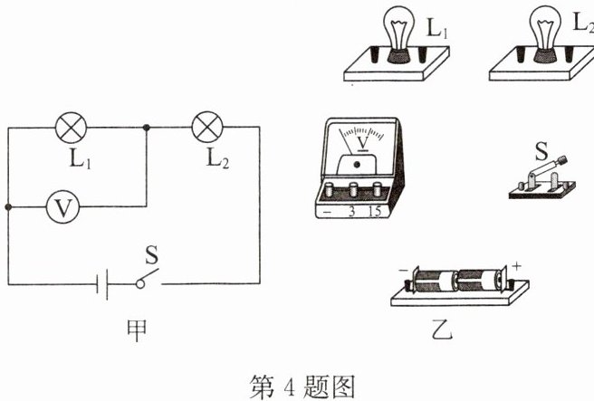 4. (2024·兴化期中)请根据如图甲所示的电路图,用笔画线表示导线将图乙中各个元件连接起来.