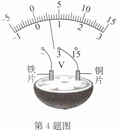 4. (2024·沭阳县期中)取一个橙子,把铜片、铁片插入其中,就制成了一个水果电池.正确使用电压表测量电压如图所示,下列说法正确的是 (