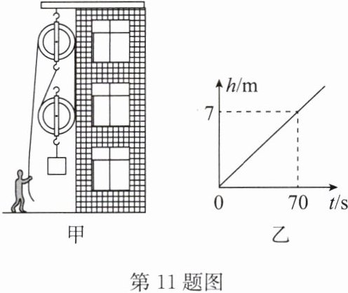 11.(2024·泗阳县期中)生活中有些低层建筑没有电梯,房屋装修时工人师傅常用滑轮组提升重物.某工人用图甲所示的滑轮组将400N的重物匀速提升7m,拉力$F= 250N$,重物上升的高度h与所用时间t的关系图像如图乙所示.已知工人的质量为50kg,不计绳重和摩擦,g取10N/kg.求: