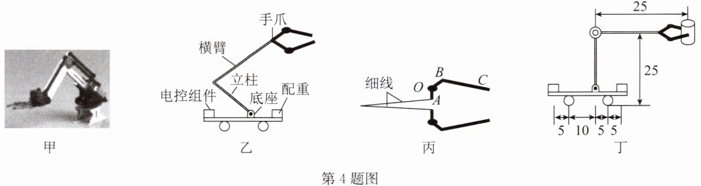 4. 机械手臂是机器人技术领域中的自动化机械装置,能够接受指令,完成抓取、伸缩、旋转和升降等动作.某实验小组制作了如图甲所示的机械手臂模型,并安装在一辆小车上,其结构简图如图乙所示:工作时安装在小车上的底座可以在水平面内自由旋转,立柱和横臂可以在竖直面内自由旋转,手爪可以抓取不同方向、不同高度的物体.