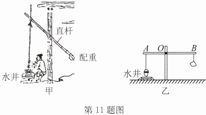 11. 如图甲所示是《天工开物》中记载的三千多年前在井上汲水的桔槔,直杆的一端用竹竿与水桶相连,另一端绑上一块重石头.汲水时人的主要用力方向是向下的,由于向下用力可以借助人的体重,因而大大减轻了人提水时的疲劳.试运用所学知识,解决以下问题.(以杠杆在水平位置时的受力平衡来分析计算)
