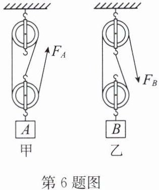 6. 如图所示,用相同的滑轮安装成甲、乙两种装置,分别用 $ F_{A} $、$ F_{B} $ 匀速提升重力为 $ G_{A} $、$ G_{B} $ 的 $ A $、$ B $ 两个物体.物体被提升相同的高度,不计绳重和摩擦,下列说法一定正确的是(