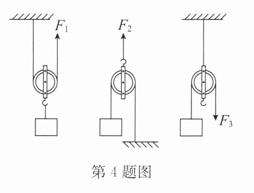 4. 使用如图所示三个装置分别用$F_{1}$、$F_{2}$、$F_{3}$匀速提起同样的重物,不计滑轮的重力和摩擦,则$F_{1}$、$F_{2}$、$F_{3}$的大小关系为(