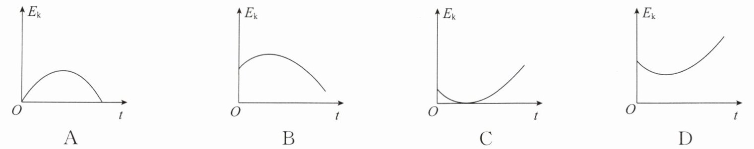 6. (2024·泰州模拟)实心球是中考体育测试的一个重要项目,小明斜向上与水平方向成 $ 45^{\circ} $ 角抛出实心球. 从球离开手到最后落在地面的过程中,则动能 $ E_{k} $ 随时间 $ t $ 的变化关系(不计空气阻力)最接近图中的哪一个 (