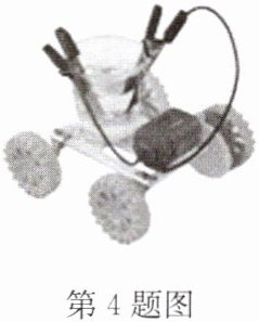 4. (2025·高邮月考)如图所示是一辆“盐水动力”玩具车,车身上方固定了一个小塑料杯,塑料杯壁内侧有一片镁片和一片碳片,当向杯中倒入盐水,使镁片和碳片都浸入盐水时,小车就能缓缓向前运动. 插入镁片和碳片的盐水杯相当于电路中的 (