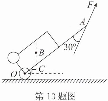13. (2024·新沂校级月考)如图所示为一拉杆旅行箱的示意图,将其视为杠杆,O为支点,B为重心,BC为竖直方向,A为拉杆端点,已知箱重为250N,OA为120cm,OC为24cm.