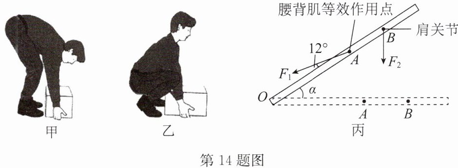 14. 从地面上搬起重物我们的常见做法是弯腰(如图甲)或人下蹲弯曲膝盖(如图乙)把它搬起来,哪种方法好呢?下面就建立模型说明这个问题.把脊柱简化为杠杆如图丙所示,脊柱可绕骶骨(轴)O转动,腰背部复杂肌肉的等效拉力$F_{1}$作用在A点,其实际作用方向与脊柱夹角为12°且保持不变.搬箱子拉力$F_{2}$作用在肩关节B点,在B点挂一重物代替箱子.用弹簧测力计沿$F_{1}$方向拉,使模型静止,可测出腰背部复杂肌肉拉力的大小.接着,改变脊柱与水平面的夹角即改变杠杆与水平面的夹角α,多次实验得出结论.
