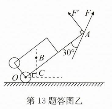 (2)F方向如答图乙中F'所示时,动力臂最长,为OA,动力最小,