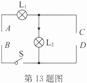 13. 如图所示,根据电路图中所标出的电流方向,在图中的AB和CD间分别填上一个电池或一只电流表的符号。要求:①使电路中实际的电流方向和图中所标出的方向一致;②符合电流表的使用要求。