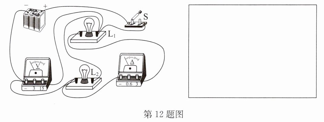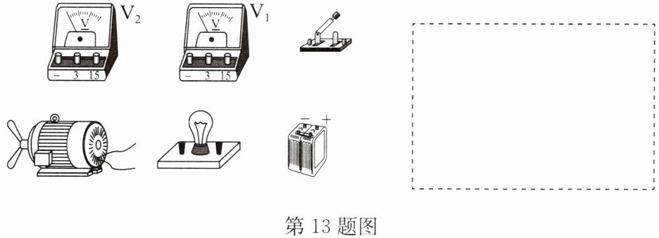 13. (2025·泗阳县月考)如图所示电路,将电灯和电动机组成串联电路,用电压表$V_1$测量电灯两端的电压,用电压表$V_2$测量电动机两端的电压,电压表的示数都不超过3V,请把图中的实物连接好,并按连接好的实物图在右边虚线框中画出电路图.