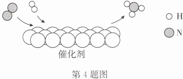 4.D 点拨:A.常温下氮气化学性质稳定,不易和其他物质反应,错误;B.从微观示意图可知,该反应的化学方程式为$\mathrm{N_2+3H_2\xlongequal{催化剂}2NH_3}$,所以$\mathrm{N_2}$和$\mathrm{H_2}$按个数比$1:3$进行该反应,错误;C