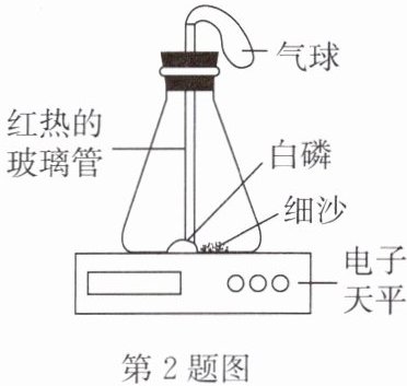 2. A 用如图装置验证质量守恒定律。反应前称得锥形瓶整体质量为$m_{1}$,引燃白磷,冷却后再称得质量为$m_{2}$。下列说法正确的是 (