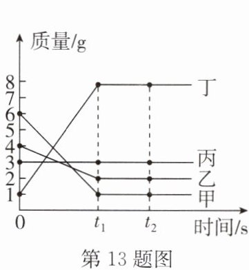 13. A 在密闭容器中加入甲、乙、丙、丁四种物质,在一定条件下发生化学反应,测得反应前及$t_{1}$、$t_{2}$时各物质质量变化情况如图所示。下列说法错误的是 (