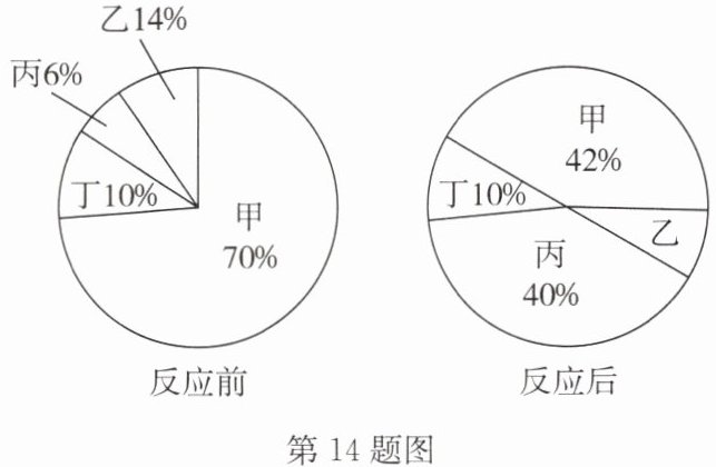 14. B 密闭容器内有甲、乙、丙、丁四种物质,在一定条件下充分反应,测得反应前后各物质的质量分数如图所示。下列说法正确的是 (