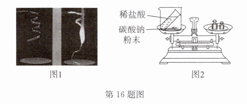 16. A 某化学兴趣小组同学对质量守恒定律进行实验探究,甲组同学用在空气中燃烧镁带的实验来探究,如图1所示,乙组同学用图2所示装置进行探究。请回答下列问题: