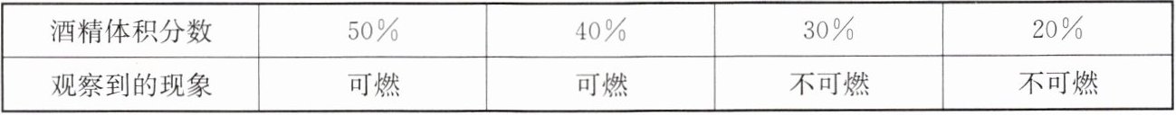 。(2)室温($20^{\circ}C$)时,小华按上述方法配制了体积分数为50%、40%、30%、20%的酒精溶液各10mL,分别倒入蒸发皿中,点燃,观察。实验结果如下表。