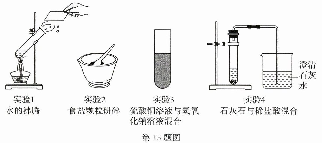 15. 化学实验中要特别注意观察和记录实验现象,如图为四个演示实验,请按要求填空。