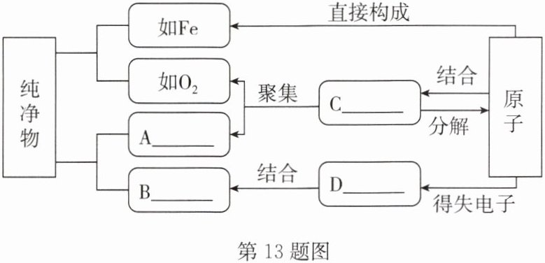 13.B如图是构成纯净物的粒子间的关系图。请在A、B处填入合适物质的化学式,C、D处填入粒子名称(仅填“分子”“原子”或“离子”)。