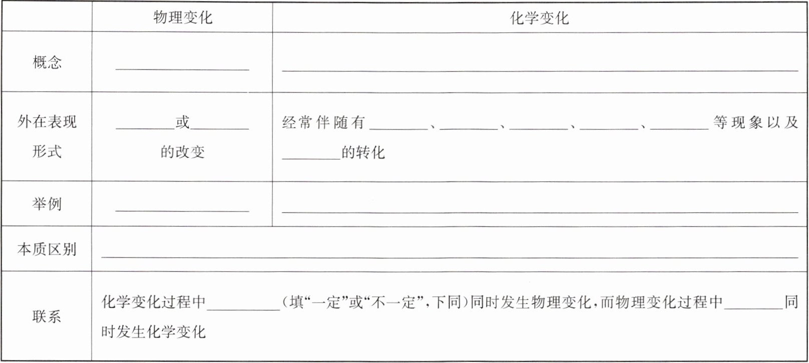 | 联系 |$ \multicolumn{2}{|c|}{化学变化过程中一定同时发生物理变化,而物理变化过程中不一定同时发生化学变化} $|