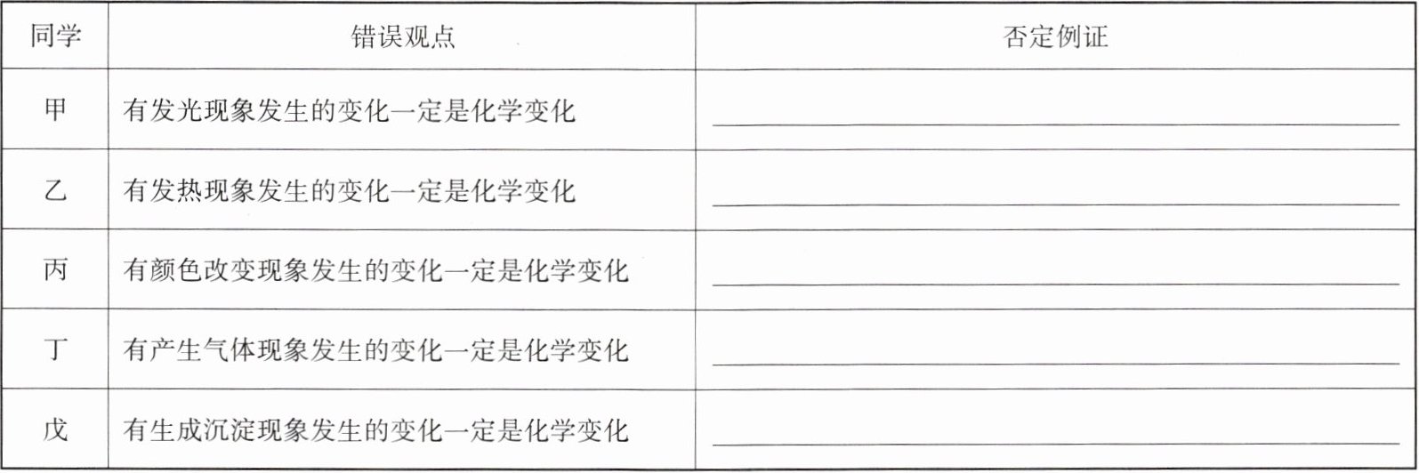 12. 物质发生化学变化时,通常会伴随发光、发热、变色、产生气体或生成沉淀等现象,这些现象可以帮助我们判断有没有发生化学变化。下表有五位同学的错误观点,请你用熟悉的日常事例来否定其错误观点。