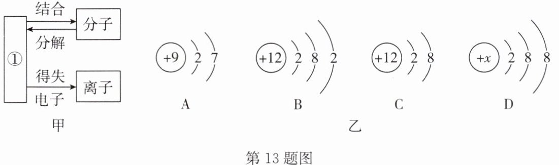 。(2)图乙中$\mathrm{D}$为某粒子的结构示意图,当$x=$