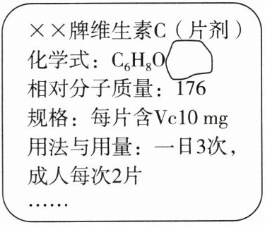 16. (2024·桑植县期中)如图是已破损的维生素C(简写$\mathrm{Vc}$)的说明书部分信息,其化学式:$\mathrm{C}{}_{6}\mathrm{H}{}_{8}\mathrm{O}{}_{x}$。已知维生素$\mathrm{C}$由碳、氢、氧三种元素组成。请回答:
