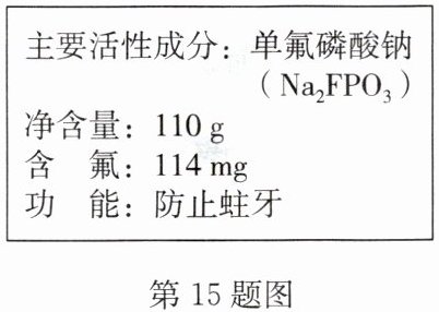15. 如图是某品牌牙膏包装盒上的部分说明。其主要活性成分单氟磷酸钠($\mathrm{Na}{}_{2}\mathrm{FPO}{}_{3}$)是牙膏常用添加剂之一,实验表明牙膏中单氟磷酸钠质量分数达到$0.76\%\sim 0.80\%$时,防龋齿效果较好。