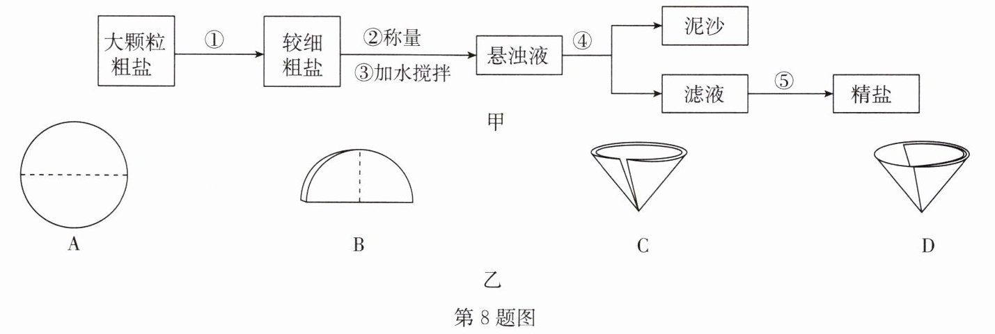 8. B 化学实验中,水有着许多重要的用途。例如,提纯含少量泥沙的粗盐,常用水进行分离。其操作流程如图甲所示。