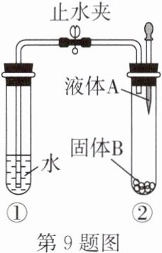 9. B 如图所示, 打开止水夹, 将液体 A 滴入试管②中与固体 B 接触。若试管①中的导管口有较多气泡产生, 则液体 A 和固体 B 的组合可能是 (