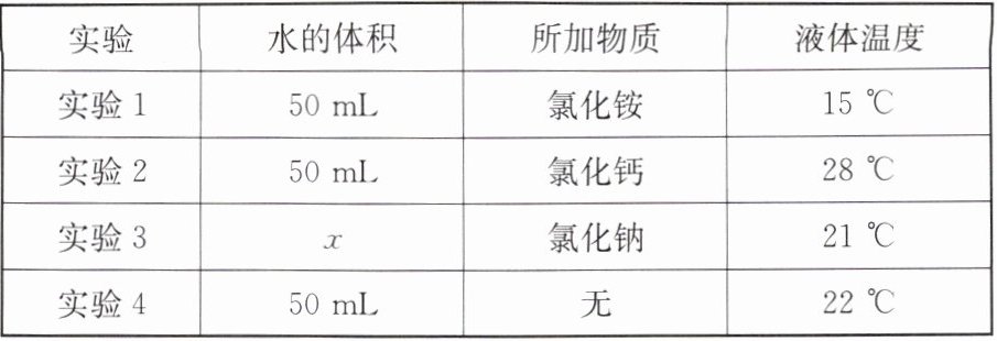 【试剂、器材】水、氯化铵、氯化钙、氯化钠;烧杯、药匙、玻璃棒、量筒、温度计等。