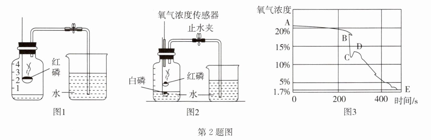 2. (2024·漳平市期中)某化学研究小组在利用如图1所示的实验装置测定空气中氧气含量时,多次实验后发现集气瓶内上升的水体积始终小于瓶内原有空气体积的$\frac {1}{5}$。为了找出原因,他们继续进行探究。