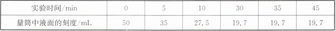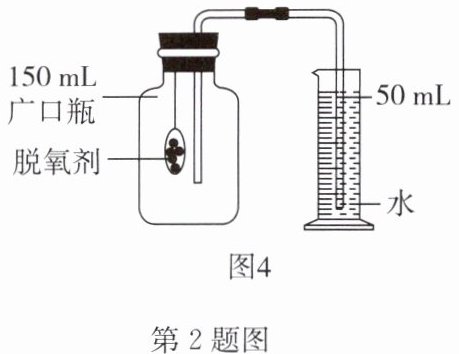 【再次探究】研究小组的同学再次查阅资料发现,食品脱氧剂(由以铁粉为主的物质组成)能通过化学反应除去密闭包装袋中的氧气,使食品处于无氧状态。他们尝试用如图4所示的装置进行实验来测定空气中氧气的体积分数,量筒中装有50mL水,记录相关数据如下表所示。